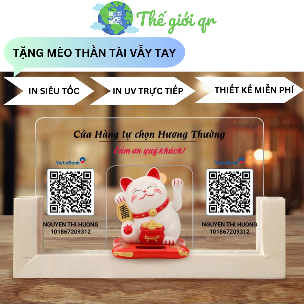Bảng mica in theo yêu cầu, in mã qr để bàn đựng mèo thần tài vẫy tay chất liệu mica bền đẹp